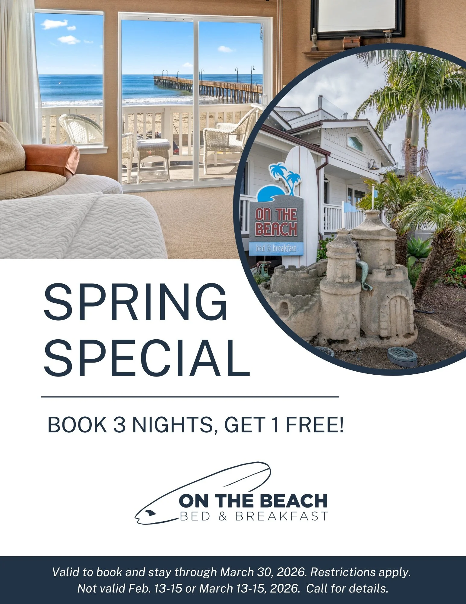 Spring is the perfect time to slow down and soak in the beauty of Cayucos. To make your coastal getaway even sweeter, On The Beach Bed & Breakfast is offering a Spring Special: buy three nights and enjoy the fourth night free.